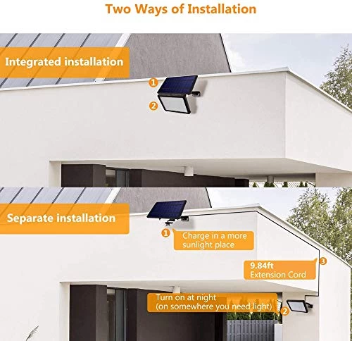 (NOTE: This outdoor solar light has no motion sensor.) TWO INSTALLATION WAYS: With integrated and separated two installation ways, JACKYLED 48 LED solar lights outdoor can better meet your lighting needs – the separated installation makes it possible to install the LED lamp panel in a sunless place where you need illuminate, and the solar panel can be placed at a distance where it can absorb more sunlight.