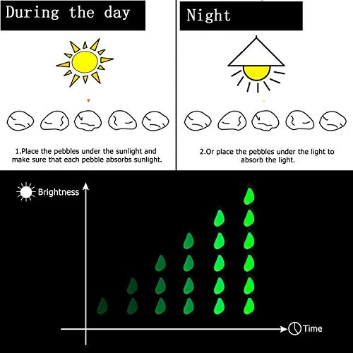 Shinning time: Glow Stones pebbles absorb sunlight during the day and give off light throughout the night. Intensity is strongest 2 – 3 hours at night after a full day in the sun.If you want it to glow all the time in the dark indoor or outdoor please install a LED UV black light above them.