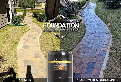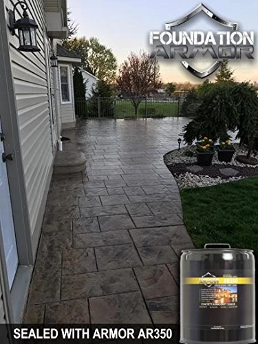 The Armor AR350 is a solvent based acrylic wet look sealer that is designed to seal, enhance, and protect a variety of interior and exterior surfaces. It penetrates deep into the surface where it chemically bonds to the pores of the concrete and pavers, creating a long lasting, non-yellowing, breathable finish that enhances dull or faded surfaces by creating a wet look and low gloss finish. The Armor AR350 is manufactured in the USA and can easily be applied with a roller or sprayer to unsealed surfaces, and surfaces previously sealed with a solvent based acrylic. Benefits: Manufactured in the USA Breathable, low VOC Can be applied with a roller or sprayer Non-yellowing and UV resistant Will reduce concrete dusting and deterioration caused by surface abrasion Offers resistance to water, stains, chemicals, and salt damage Offers superior adhesion to a variety of concrete and paver surfaces Will bring out the color in dull or faded concrete and pavers Offers a durable wet look/low gloss finish Self-priming, easy recoat and low maintenance When properly applied can last up to 2-5 years Can be applied to unsealed surfaces, or surfaces previously sealed with a solvent based acrylic. For best results, apply 2 coats, 24 hours apart. Apply in the late afternoon or early evening when air and surface temperatures are declining. Do not apply to red clay brick, slate, tile, flagstone, or other natural stone surfaces. For those surfaces consider the Armor WL550 or Armor SX5000.