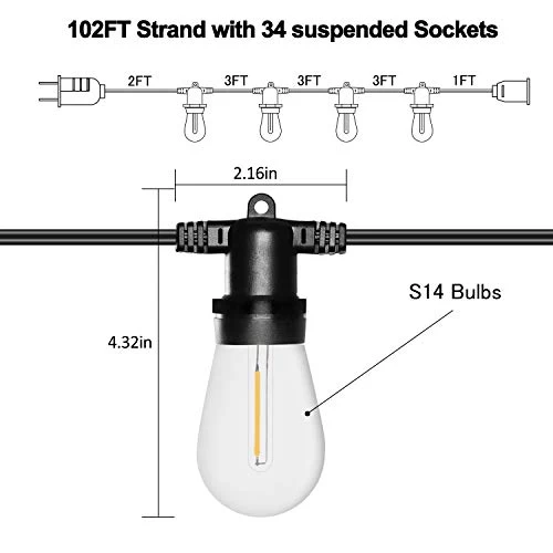 【DIMMABLE LIGHTS】– 35 (one spare) x 1 Watt Dimmable S14 bulbs for the outdoor string lights, 2700K ambience warm white lights perfectly decorates your retreat space, bulbs are dimmable, allowing you to creating the ideal scenery for any type of gathering.(Note: The dimmer is not included)