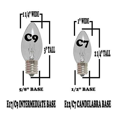 Each classic C9 bulb is 7 watts and made for 120V and comes with a transparent glass so that you can see the filament inside of the bulb. Every C9 bulb is rated for a 3,000 hour life span and will fit into any C9/E17 socket base. We highly recommend purchasing an extra box of bulbs to have on hand to be used for replacements when the time comes (ASIN B004Q690RI).