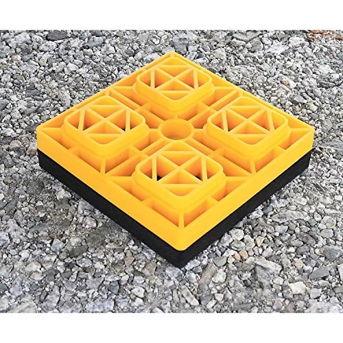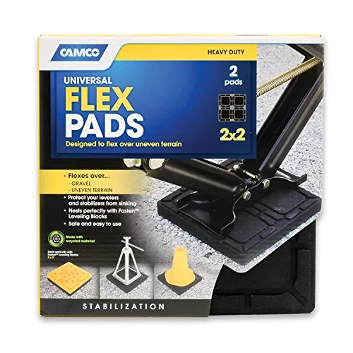 The Leveling Block Non Slip Pad works well underneath Camco and FasTen brand leveling blocks, other brand leveling blocks, or on its own to help prevent jacks and stabilizers from sinking into soft ground. The flexible material is great for use on uneven surfaces such as gravel, tree roots and rough earth to help create a more even surface. It also helps prevent the leveling blocks from cracking due to uneven stress. Non Slip Pads are UV resistant, weather-proof, and constructed of recycled materials. 2 Pack.
