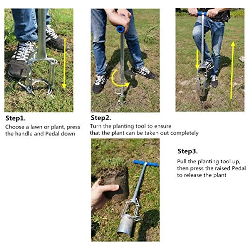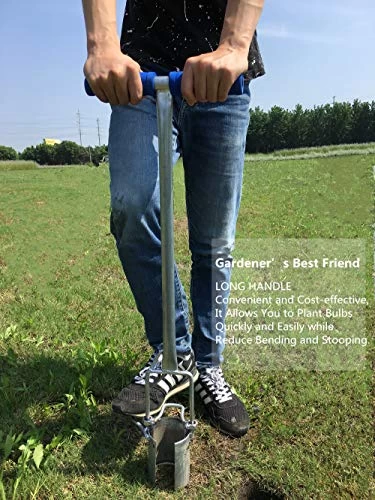 DURABLE STRONG-STEEL DESIGN – The Bulb Planter is made from carbon steel. NO RISK30 DAY SATISFACTION GUARANTEE. If it is not perfect for you, return it for a full refund orreplacement.Bulb Planting Tool by Ymachray — Push in, Turn, and Lift Up – Don’t have to getdown on your knees / No aching your back / Save your time, this tool may be thefastest way to plug – n – plant*Dig holes from a comfortable, standing position*Sharp end