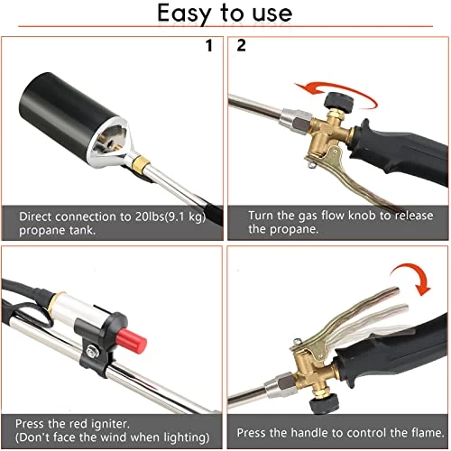 Powerful Propane Weed Burner Torch: electric ignition to ensure safety, heats-up to over 3000° F with ease, 500,000 BTU of maximum heat output.Equipped with an ergonomic luxury handle to increase comfort during use.
