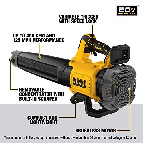 The 20V MAX* Brushless Handheld Battery Powered Leaf Blower provides the ability to clear debris with an air volume of up to 450 cubic feet per minute and up to 125 miles per hour with the concentrator nozzle. With a lightweight and ergonomic design, the cordless leaf blower gives users directional control and tackles user fatigue. The variable speed trigger and speed lock give the user full power control.