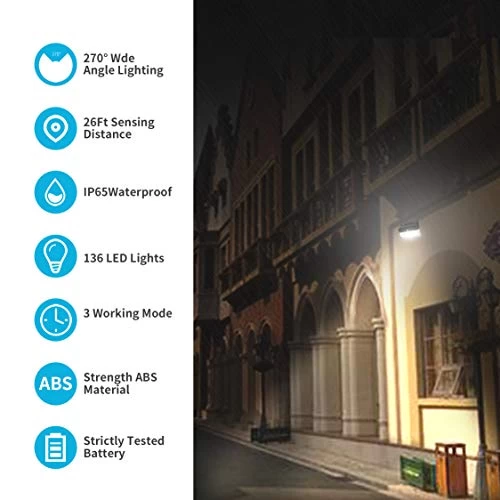 【3 Motion Sensor Modes】: Our Upgraded Super bright 206 LED Solar Light have 3 Modes for your diverse needs:① Dim light mode, ② Dim light sensor mode, ③ Strong light sensor mode. The updated PIR motion sensor detects people to up to 12-20 ft / 5-8m within angle of 180 degrees. Always ready to brighten your way home.