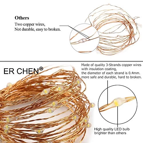 【Flexible, Durable & Waterproof】Made from high quality 3-Strands copper wires, this fairy light is durable enough to experiment with any shapes as you like. The copper wire parts of the string lights have IP65 waterproof level which is perfect for both indoor and outdoor decorations.(Warm Tip: The power adapter is non waterproof,it should be covered if used in rainy days)