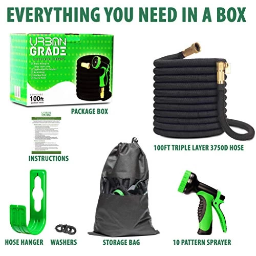 URBAN GRADE 100ft Expandable Hose | Heavy Duty Long Flexible Garden Hose | Lightweight Black Collapsible Non Kink Coil Water Hose | Retractable,Triple Latex Core and Strong Brass Connector |10 Pattern Sprayer| Hose Hanger, Storage Bag.