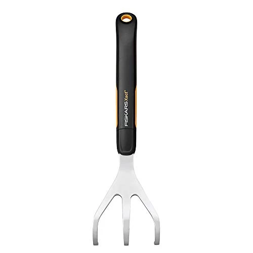 Fiskars Xact Cultivator has deep, curved tines, making it ideal for loosening and aerating soil, as well as removing weeds. A durable, stainless steel head resists rust, while a strong, fastened connection ensures durability. A comfortable, SoftGrip handle design offers multiple grip positions and a longer, weighted handle offers better balance for enhanced comfort and control. Additionally, a convenient hang hole allows for easy storage