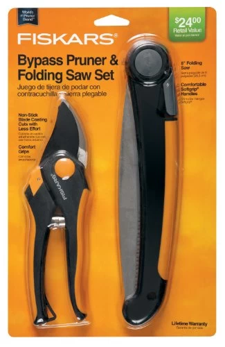 Help cut live, green growth and deadwood with the Fiskars 5 in. Bypass Pruner Folding Saw Set. The bypass pruner features a Soft grip handle for comfort and a non-stick coated blade that makes clean, easy cuts. The folding saw also includes a Soft grip handle and a triple-grind saw blade that cuts on both the push and pull strokes.