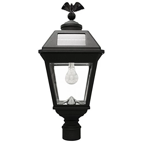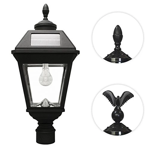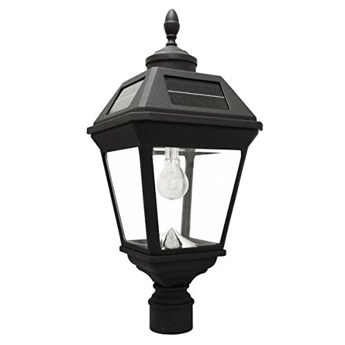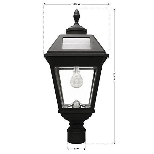 The Gama Sonic Imperial Bulb Solar Post Lamp GS-97B-F features a design inspired by traditional early 19th-century gas lanterns and fits onto any existing 3-inch outside diameter lamp post (pole not included). This outdoor solar powered post lamp is constructed of cast aluminum with a powder coated black finish and mitered glass panes and includes our patented technology, the GS Solar LED Light Bulb. No electrical wiring is required for installation, just place in a spot with direct sunshine. The replaceable Lithium-ion battery pack is good for about 1,000 charges (roughly 3 years) and charges when sunlight hits the solar powered post lights integrated solar panels. At dusk, this solar outdoor post light will turn on automatically and shine at 180 lumens in a warm-white color temperature for up to 10 hours on a full solar charge. The solar post light fixture is designed for dusk to-dawn-operation after its battery has been fully charged during the day. The monocrystalline silicon solar panels are protected by weather-resistant, cleanable tempered glass that helps ensure long-lasting reliability. A sunny day without overcast should be sufficient to provide a full recharge. Recharging speed will vary based on weather conditions, but no charging will occur if direct sun does not shine on the solar panels. Do not locate the solar post light in a shaded area. For any product questions or unexpected issues with your Gama Sonic product, our support team at our Atlanta headquarters is here to help. Note: For warranty claims, contact Gama Sonic USA customer support by phone at 1-800-835-4113 from 9 a.m. to 5 p.m. Eastern time or by e-mail at [email protected].