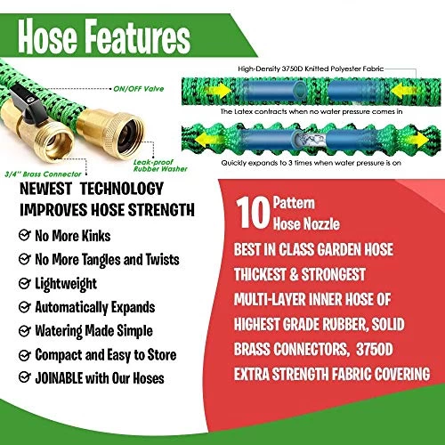 Our lightweight hose is easy to lift, stretch and maneuver as you water your lawn, wash your car, dog . Its stretchy, expandable hose body will never tangle, twist or kink, while its sturdy brass connectors will never burst, leak or break.