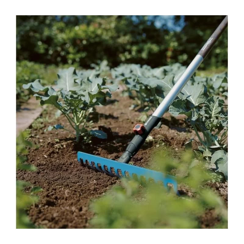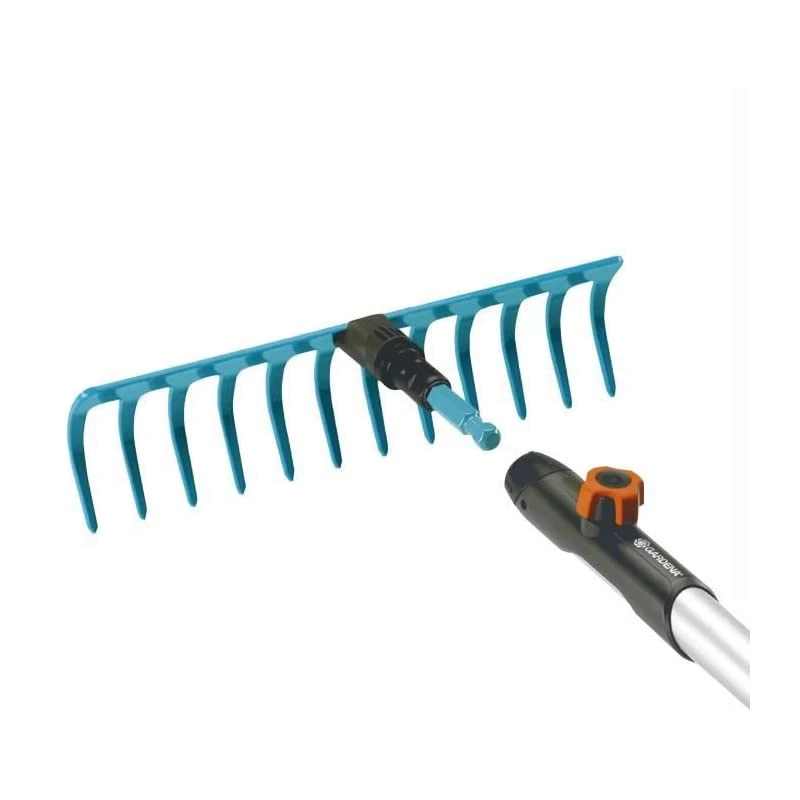 The GARDENA combisystem Rake is a practical multi-purpose rake and is ideally suited for raking, levelling or working the soil. The rake has a working width of 36 cm with 14 tines and is suitable for all GARDENA combisystem handles, whereby GARDENA recommends a handle length of 150 cm, depending on the body height.<br><br>Wobble-free connection<br>The combisystem product is simply connected to the handle and screwed tight. The reliable technology guarantees wobble-free and reliable work.<br><br>Fits all handles<br>GARDENA combisystem tools fit all GARDENA combisystem handles. Whether your handle is made of wood or aluminium, or designed to spare your back, it is up to you.<br><br>Corrosion-proof<br>The GARDENA combisystem Rake is made of high-quality, duroplast-coated steel that optimally protects the product against corrosion.<br><br>25-year manufacturer’s warranty<br>A 25-year warranty guarantees highest qua