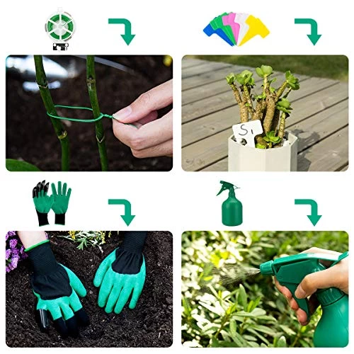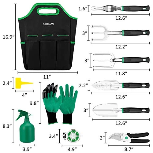 【Full set of gardening tools】GIGALUMI gardening tool set consist of 11 tools. You will get six hand tools, a carrying tote, a plant rope , a pack of plant tags label , a pair of gardening gloves and a sprayer , can to meet all your gardening needs.