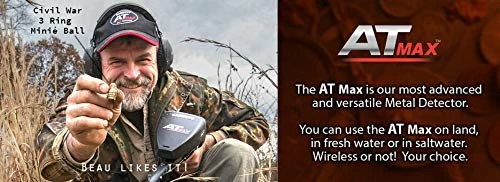 Garrett AT MAX is our most versatile and advanced all-terrain VLF metal detector. With increased detection depth, built-in Z-Lynk Wireless Technology, and many other improvements, AT MAX helps treasure hunters push their limits to the MAX! Key Features NEW Built-in Z-Lynk Wireless Technology Cut the cord! Integrated circuitry transmits audio to your wireless headphones. Six times faster than Bluetooth speed! Auto pairing. No cables, and no interference from other wireless devices. NEW Garrett MS-3 Z-Lynk Wireless Headphones included The speed of Z-Lynk Wireless Technology, and high-fidelity audio…with no cords attached! Maximum Detection Depth Increased transmit power and enhanced electronics provides AT Max with significant depth increase. True All Metal Mode Detects all types of metal and provides the greatest possible detection depth and sensitivity. Backlight: Illuminates LCD screen for improved visibility in low-light situations. Optimized Frequency The AT Max’s 13.6 kHz operating frequency provides excellent detection on a wide range of targets—including silver coins, gold jewelry, and brass relics. High Resolution Ground Balance Automatic and manually adjustable for improved performance. Includes 175 points of Ground Balance resolution, allowing the AT Max to handle both conductive soils (such as saltwater beaches) and highly mineralized ground. Automatic Ground Balance Window Garrett Exclusive feature will simultaneously ground balance to a range of values to help overcome localized ground variations. By reducing subtle ground responses, the Automatic Ground Balance Window smooths detector audio and allows the user to hear faint targets. Larger Display Numbers: Digital Target ID number, Iron Discrim number, etc. More Controls—All easily accessible with a single finger as you search.