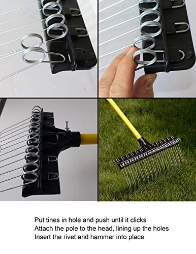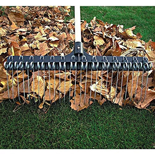 PACK OF 2. Torsion springs do everything: finish grading, spreading mulch, lifting thatch, and much more. The aggressive angle to which the tines are formed makes the rake dig right in without the need for pushing down on it-thus allowing no down pressure. This permits you to stand straight up while using the rake, and makes it much easier on your back. With the pressure off your back, this rake allows you to work longer and accomplish more with less effort than you need to exert with other rakes. This feature allows you to work effectively with any number of different materials and get very effective results. Because of the materials used to make the rake, not only is it extremely durable, it is also very lightweight. The fiberglass handle and no break co-polymer head makes this rake almost impossible to destroy. The swivel hanger at the end of the rake makes it easy to hang on any hook out of the way when not in use. Equipped with a 55-inch fiberglass handle. 21-inch rake head.