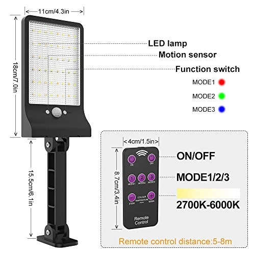 【3 LIGHT MODES + REMOTE CONTROL】48LED solar light outdoor with high sensitive motion sensor detectors, 3 working modes:1/2 Brightness Light+ Motion Sensor Full Brightness Light, Off + Motion Sensor Full Brightness Light,Full Brightness Light. Remote control function: , with ON/OFF button to save energy.Leave your hands free, no need to touch the solar motion sensor lights on the wall, deck,fence.