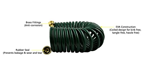 Lightweight, yet strong and durable and UV-resistant EVA construction and coiled design for kink-free, tangle-free, hassle-free, effortless handling, ideal for outdoors, gardens, yards, lawns, greenhouses, flowerbeds, and etc.