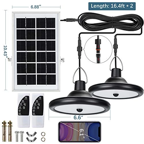 Our outdoor remote control solar pendant light is ideal for indoor or outdoor lighting and has a classic, fashion and almost industrial look that can be used as pendant lights or wall lights. Not only does it have the classic look of a downlight and 16.4ft extension cord, but it also comes with a remote control that gives you more flexibility in where you place it. The solar panel and the light body are designed separately. The solar panel is powered by sunlight and store power during the day, ready for use at night. Each lamp has built in 4400mah lithium battery, bright 56pcs LED beads, save energy and money, adjustable brightness and time, the solar lights can be installed anywhere, high security. Charge it during the day and automatically lighting at night.
