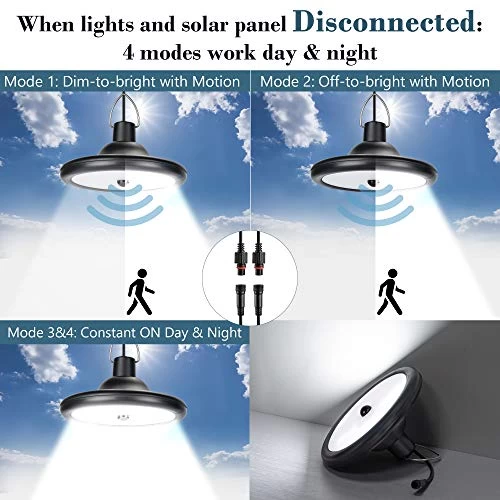 4 Lighting Modes with Motion Sensing: Featuring 4 lighting modes and equipped with a motion sensor in each lamp, this solar pendant light is triggered by motion in Mode 1 (Dim-to-Bright with Motion at night) and Mode 2 (Off-to-Bright with Motion at night). The motion sensor solar lights also work both in a dusk-to-dawn way (Mode 3) and in an all-day manner (Mode 4).