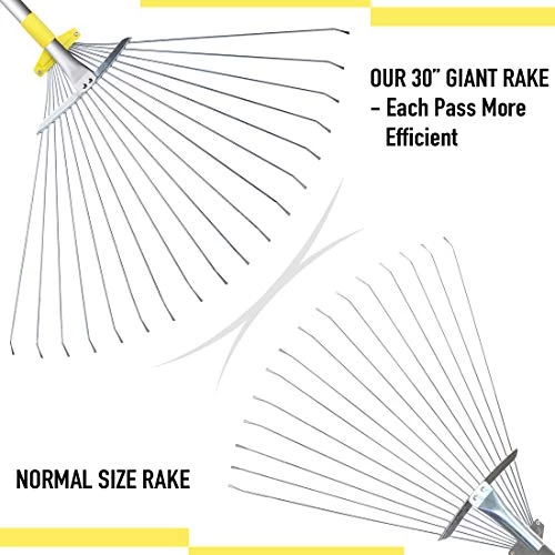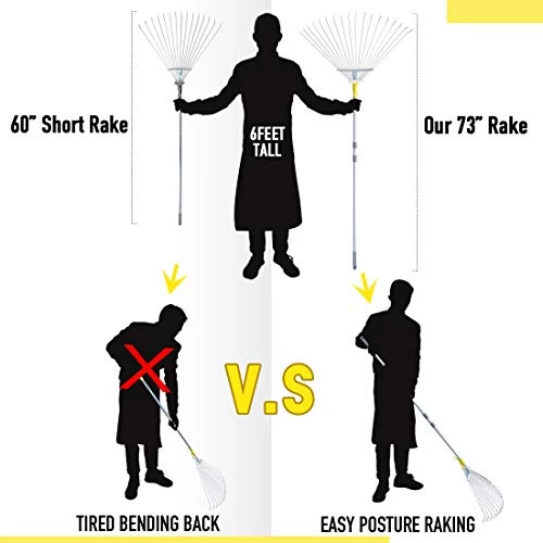 73” LESS BENDING & 30” BIGGER EFFICIENT HEAD: 73” longer leaf rake allows less bending down and less fatigue during long time work. The 30” larger rake head is designed to collect more debris with each pass efficiently. Adjust leaf rake head at any width easily in seconds by turning the yellow lock anytime.