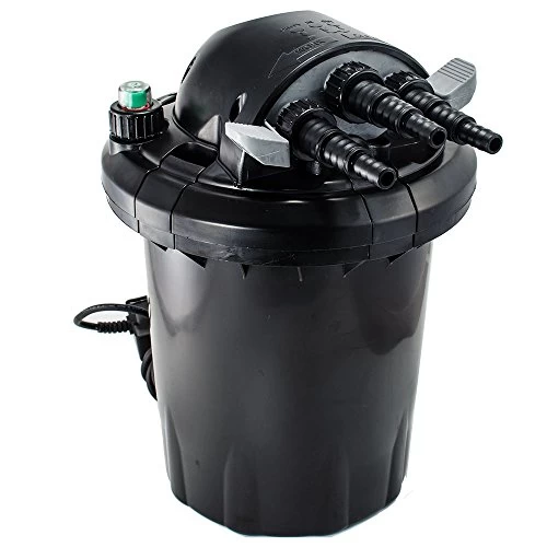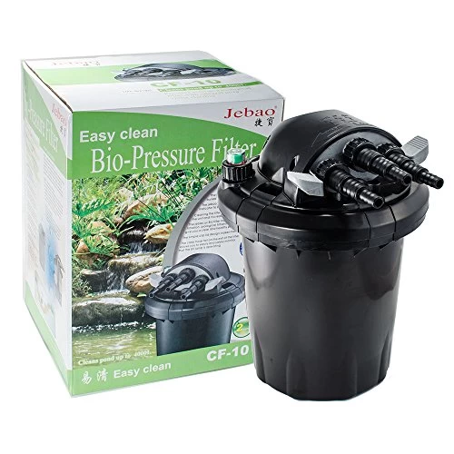 This Jebao CF-10 pressure filter come with an intergrated 13 watt UVC, back wash facility, cleaning inddicator and a UVC viewing window. If you have a nature pond with plants, this filter clean up to 1500 gallon pond. If you have a gold fish pond with some plants, this filter clean up to 1000 gallon pond. If you have a koi pond or large fish, this filter clean up to 500 gallon pond. HOW DOES IT WORK? STAGE 1 – MECHANICAL FILTRATION: Water is pumped into the filter creating the necessary pressure to begin the mechanical filtration stage. Two foam discs collect various sizes of unwanted organic debris encouraging the growth of large numbers of beneficial bacteria which break down harmful pollutants. STAGE 2 – BIOLOGICAL FILTRATION: At this stage the water passes through the bio-balls at the bottom of the filter. These have a large surface area & provide a habitat for beneficial bacteria to grow which naturally convert the harmful toxins of ammonia & nitrites into useful nitrates to support a healthy pond environment. STAGE 3 – UV CLARIFICATION: The water which may contain microscopic suspended algae spores passes the UV lamp clumping and killing the spores to give crystal clear water. WHY This External Pond UV Bio-Filter SO EFFECTIVE? Water is slowed down as it passes the lamp to increase UV penetration Quartz glass tube covering the UV lamp permits effective penetration of UV rays. Ordinary glass cuts this by 90% UV lamp runs at optimum operating temperature in an enclosed chamber Water is kept as close as possible to the UV lamp to maximize UV efficiency Single ended lamps last longer and have higher UV output