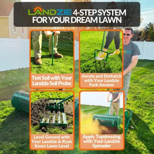 HAVE THE LAWN OF YOUR DREAMS: Revitalize your lawn this season by using the Landzie Fork Aerator to remove compacted soil and thatch and promote healthy grass growth throughout. Aerating your lawn encourages healthy root growth, enhances resistance to drought and flooding, and reduces the need for excessive amounts of fertilizer. USE WITH the Landzie Spreader (B07ZQSV81S) and the Landzie Lawn Level (B095KSKXPQ) for a lush and level lawn this season.