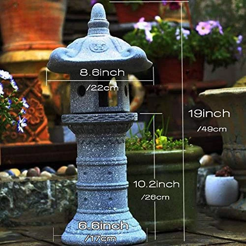 Our large Japanese style Zen pagoda lantern sculpture measures 8.6″dia.x19″H. 6.6 lbs. making it the perfect home or Asian meditation garden decoration!