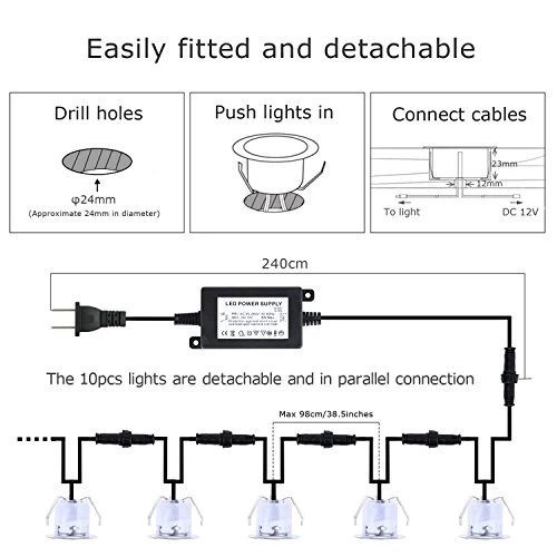 【Easy Installation】Drill holes, push lights in and connect cables. Can be installed for outdoor or indoor decoration, like deck step, stair, kitchen, stairway, bathroom, shelve, cabinet, living room, fountain, pool, backyard, eaves, fence, pergola, walkways, outside, accent lighting. The 10pcs lights are detachable and in parallel connection(The kit still works if one or two of them fails), so you can install all or part of them.
