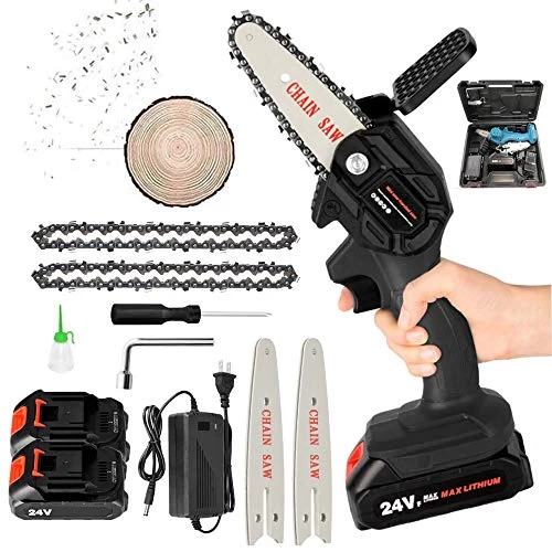 【Value package】This set contains: 1 pcs mini chainsaw, 2 Original guide,2 Original chain, 2 batteries, 1 charging power supply, 1 small oil bottle, 1 screwdriver, 1 small wrench, 1 installation manual.