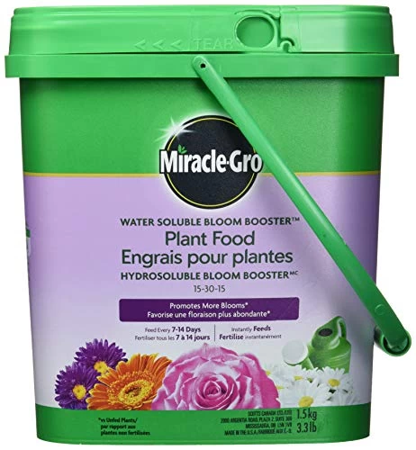 When it comes to plants and flowers, it’s all about the flowers and foliage. For lots and lots of big, beautiful, colourful blossoms, feed your indoor and outdoor plants with Miracle-Gro Water Soluble Bloom Booster Plant Food 15-30-15. Promotes More Blooms on both indoor and outdoor plants. Mixes easily with water. Starts to work instantly, too. To use, apply with a watering can around the base of the plant until the soil is soaked. For even more convenient feeding on your outdoor plants, use with the Miracle-Gro Garden Feeder and a garden hose.