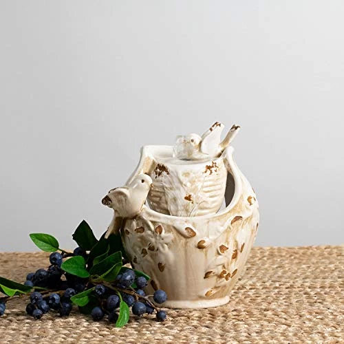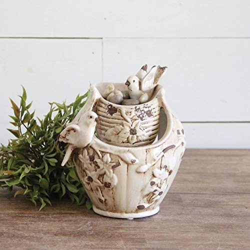 Distressed Bird Fountain, Ivory. A gracious and charming accent for any setting. A bathing songbird and her attentive companion add grace and character to the Ivory Distressed Bird Fountain, part of the Nature’s garden. Collection. Created by a gifted team of artisans, this Piece. Features three-dimensional songbirds and embossed flowers on a fluidly formed vessel, hand glazed in ivory with rich Brown highlights and carefully distressed for an exceptional antique look. The fountain is made with quality high-fired Porcelain and measures 6-Inch by 5-Degree-Inch, standing 7-Degree-Inch high. Each of our distressed fountains includes a package of polished stones and a variable speed water Pump.