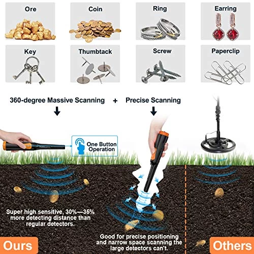 The long neck of the detector for massive 360-degree searching and the detector pinpoint for precise locating. The sensitivity has been increased by around 35% than a regular metal detector, which means 35% more possibility to find treasures.