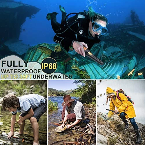 ⭐Remarkable WATERPROOF 18-35 ft Underwater – This LATEST UPGRADED detector is full IP68, after factory test the whole body works well even 18 ft(minimum 5 meters as in manual) to 35 ft ( 10 meters ) underwater. A reliable water-proof deep water detector for metal hunting in rainy days, river, brook, pond, lake, sea or sunk wreck, underwater relics.