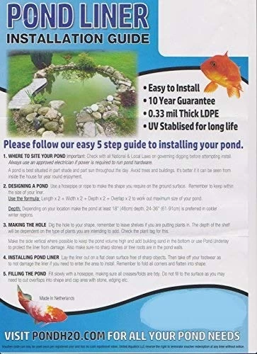 Size is 13′ 1” x 16′ 4” Thirteen Feet One Inches x Sixteen Feet Four Inches (4mx5m) Pondh2o LDPE Pond Liner is a good quality economy liner that is perfect for small to medium sized ponds. Manufactured from high quality LDPE (Low Density Polyethylene) material, these liners are extremely good value while still maintaining great puncture and tear resistance.