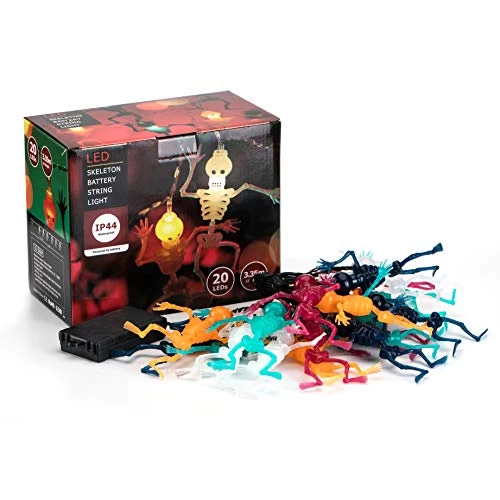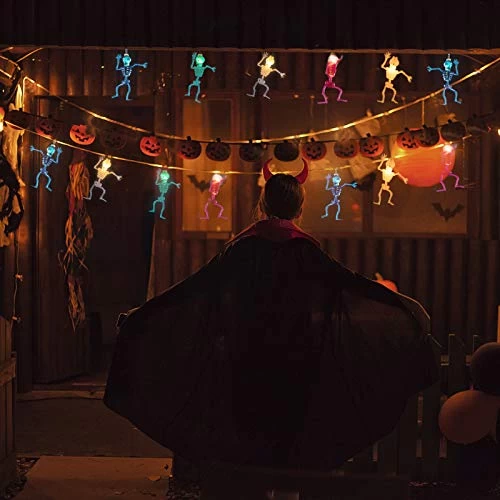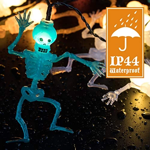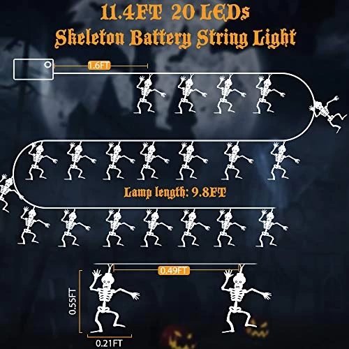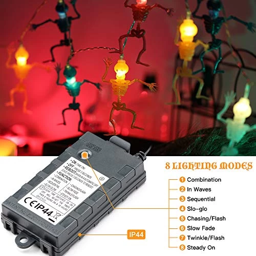 🎃[UNIQUE DESIGN]: Each light string has 20 skeleton lights with 5 different colors (white, green, blue, red, yellow).Not only that, it also has 8 lighting modes,Combination, In Waves, Sequential, Slo-glo, Chasing Flash, Slow Fade, Twinkle Flash, and Steady On you can choose the constant light or flashing mode, making your carnival party more unique.With memory function, there is no need to repeatedly set the light mode you like.