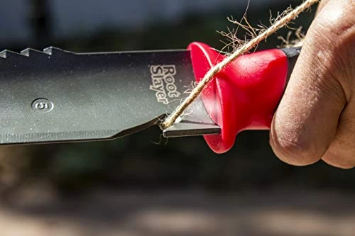 We might have called the Root Slayer Soil Knife the Root Slayer Hori Hori, but we were afraid people might not know about one of the oldest and most essential garden tool designs of all time. Based on original Japanese designs, but updated with modern materials and style, the Root Slayer Soil Knife can perform the functions of almost any hand tool in the garden. Use it as a substitute for a trowel, transplanter, cultivator, or most importantly, a weeder. This handy digger will cut through root-filled, heavy clay soil with surprising ease. When in the lawn, garden, or potting shed we never like to be without this versatile garden tool. Delivered with an enamel powder coating, the Root Slayer Soil Knife features an array of a dozen saw-like cutting teeth on one side, a long sharp blade on the other side, the signature Root Slayer inverted V blade tip, and a combination twine cutter and bottle opener near the ergonomic grip. Feel free to sharpen any or all of the mid-carbon steel cutting surfaces for a very long lasting edge.