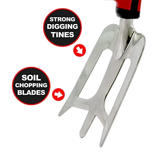 [UNIQUE VERSATILE SOFT TOUCH DUAL GRIP DESIGN GIVES MORE POWER & CONTROL] – The ergonomic dual grip design allows huge versatility and superior comfort when digging and cultivating in different ways. The top vertical grip and cradle allows you to generate more power with increased support when required, whilst the lower grip allows for more dextrous accurate work. Ideal for people with weak hand or arthritis.[UNIQUE NON CLUMPING SOIL CHOPPING BLADES] – The unique soil chopping blades and tapered tine design makes light work of digging, turning soil and breaking up lumps and clumps easily and quickly. Makes a great weeding tool.