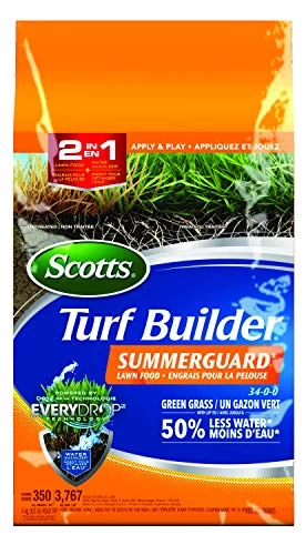 Summertime and green grass are meant for each other. Yet, summer stressors like hot sun and meager rainfall do their best to keep them apart. You can do something about it with Scotts® Turf Builder® SummerGuard® Lawn Food 34-0-0. This 2-in-1 lawn food helps build strong, deep roots, and keeps grass green and healthy all summer long. Powered by EveryDrop™ Technology helping drive water down into hard, dry soil saving you water and watering time. Reduces wasteful water runoff, too. Scotts® Turf Builder® SummerGuard® Lawn Food 34-0-0 helps grow green grass with up to 50% less water*. A perfect summer pairing.