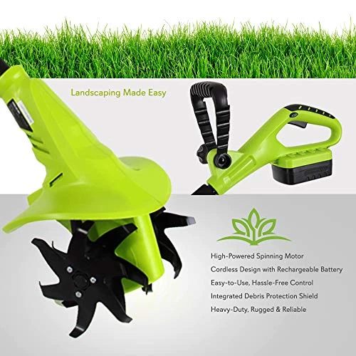DEBRIS PROTECTION SHIELD: The heavy-duty, rugged battery powered handheld soil cultivating machine features integrated debris protection shield to prevent soil and dirt from splattering everywhere and getting to your clothes.