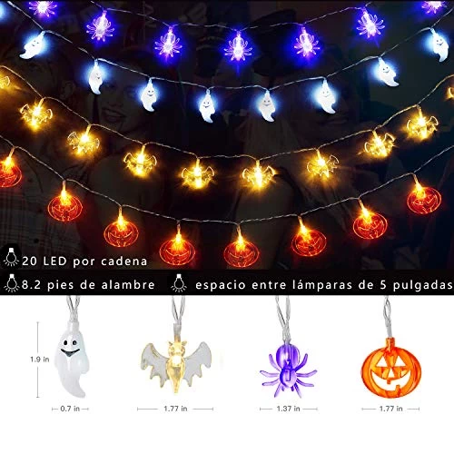 【Best Halloween Decoration Lights】You will get a perfect combination of Halloween decorations lights.The Combination contains 4 packs LED halloween tree lights strings:Orange Pumpkins lights,Blue Spiders lights,White ghosts lights,Warm white bats lights.Each Halloween string lights has 20 led lights, totally have 4*20 LEDs,each string 8.2ft length.The 3D shapes make them look true,add an extreme spooky and festival atmosphere to your Halloween themes,carnival,celebrations.