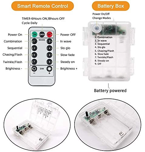 1.Press the “on” button to turn on the string lights, select the “Mode” you like, then press the “Timer” button, the lights will keep the current mode 6 hours and then auto off. 6 hours on, 18 hours off, continue to cycle.