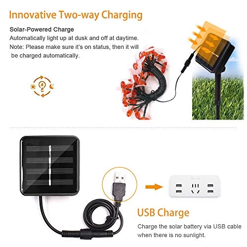 Two charging options- Solar powered charge or USB charge. Charge the solar battery via USB cable when there is no sunlight.