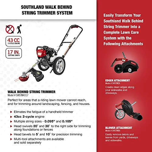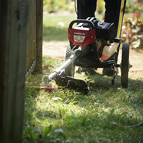 The Southland 43cc wheeled string trimmer makes lawn care easier than ever. The Southland 43cc wheeled string trimmer features a 20⁰ trimmer head swivel adjustment for wall or fence trimming & a 10⁰ trimmer head bevel for precise edge trimming. Easy maneuverability helps you get into the tight corners & odd spaces that mowers can’t get to, while the 12″ durable ball bearing wheels allow the trimmer to handle rough & rugged terrain. The Southland 43cc wheeled string trimmer will help you cut even the biggest jobs down to size.