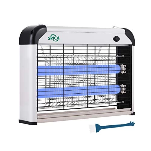 SPICA Pest Killer Design: Double face designed for 360 degree attracting and killing mosquitoes flies etc. Flame resistant material housing can prevent any fire accident caused by fired flies. High-density grids prevent children and people touch inside, The pure aluminum frame is easily for cleaning, antioxidant, sturdy, lightweight. The insect killer device has a hang metal chain, it can stand on any flat surface and also can hang-up. The collection tray is easy to take it out and clean