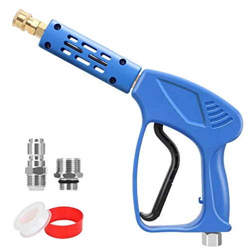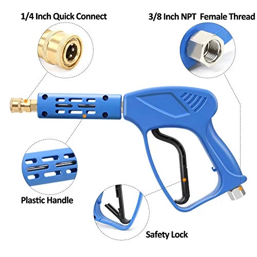 STYDDI Universal pressure washer gun is one of the most effective tools to utilize the full potential of your pressure washer machines. It fits most gas or electric pressure washer models. To get the most compatibility to different pressure washer types, this pressure washer gun set comes with 3 different inlet fitting options, including G 3/8″ quick connector, M22-14mm thread connector and 3/8″ NPT pipe thread connector. The maximum water pressure of this gun is 5000 PSI, which is well above average for a pressure washer gun. Its powerful cleaning make it possible to safely and effectively clean variety of surfaces. Perfect for home cleaning and professional cleaning. The gun is made of engineering plastic, brass and stainless steel, which makes it durable and sturdy. It also has an ergonomic handle which is designed for comfort when you are holding it, and safety locking mechanism which means you will never accidentally let water out of the gun or drop the gun itself. In a word, STYDDI pressure washer gun will not let you down.