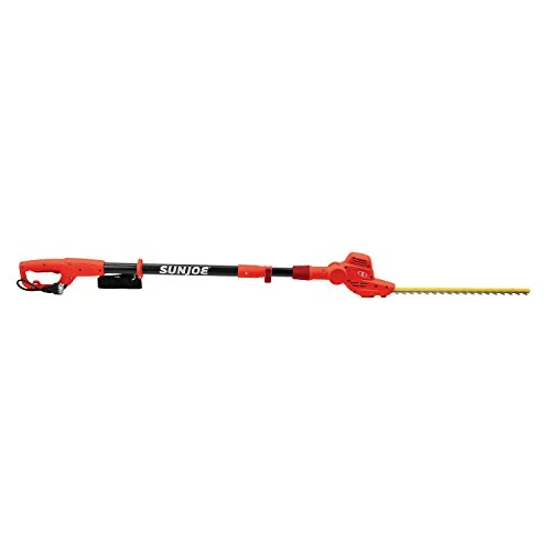 GIVE YOUR TALLEST HEDGES CLEAN-CUT EDGES Ditch the ladder and shape up the shrubs while you stand safely on solid ground with the Sun Joe Multi-Angle Telescoping Pole Hedge Trimmer. Sun Joe’s 7.4 ft extension pole provides up to an impressive 13 ft of overhead reach, while the durable 18″ rust-resistant, hardened steel blades let you reach higher and sweep farther with each pass for perfectly sheared shrubs. The powerful 3.8-amp electric motor and multi-angle pivoting head allow for precise trimming of most tall hedges and bushes beyond your reach. And SJH901E-RED is also great in tight spaces to groom where a traditional hedge clipper simply can’t cut it ? like between the house and the hedges, between ornamental plants and the fence, or beneath the bushes. SJH901E-RED features a quick-release strap and safety button to prevent accidental starts, and a sheath for safe blade storage when the day is done. Cut your hedge trimming chores down to size with the handy Sun Joe Electric Telescoping Pole Hedge Trimmer.
