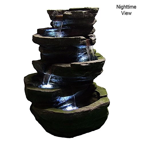 EASY TO USE: No plumbing is required and the garden fountain plugs into any standard electrical outlet; Features 4 LED lights in the bottom 4 levels to illuminate your yard at night