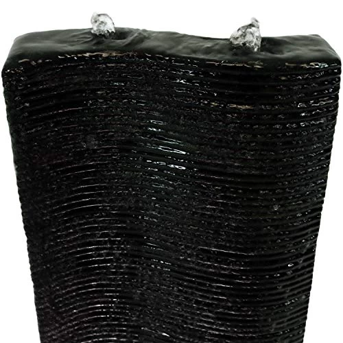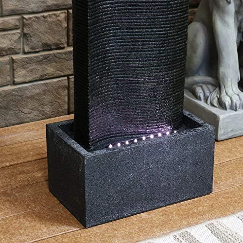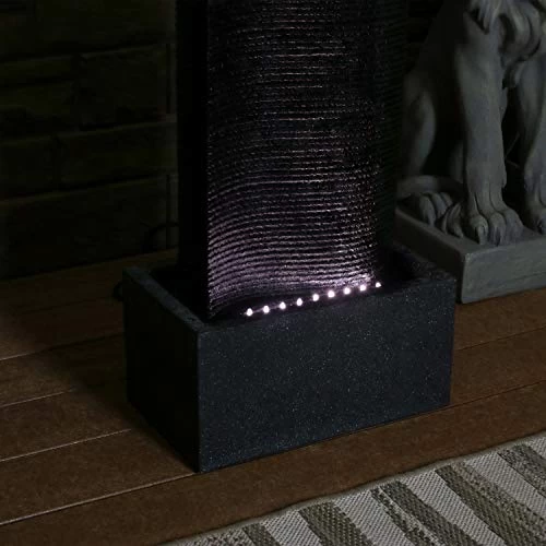 Enhance any garden or patio with this impressive lighted water feature. Made of lightweight and durable polyresin, this fountain can easily be moved to an ideal location, yet can withstand the elements outside. Atop the center column, water bubbles up in two spots and then flows down the textured ridges. The basin features lights that highlights the water as it falls down the sides of the column. This beautiful fountain does not require any complicated plumbing or installation, thanks to the included electric submersible pump.