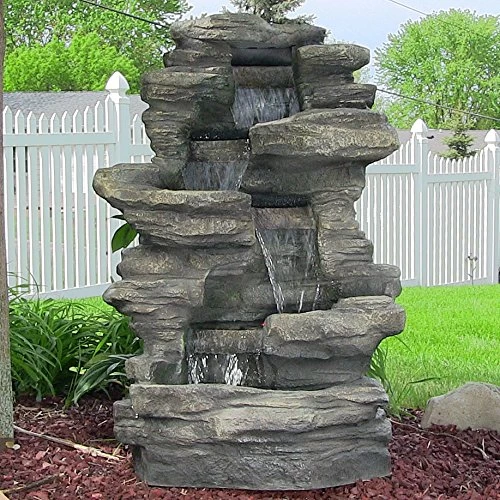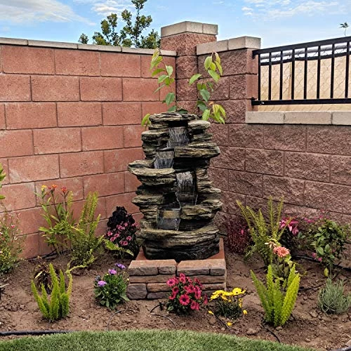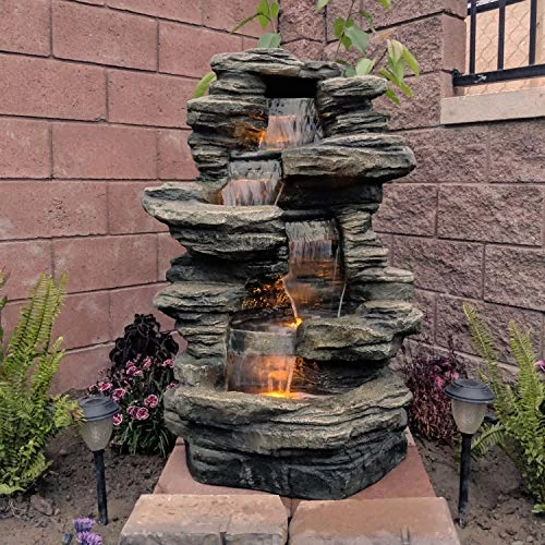 Whether this outdoor water fountain with LED lights is placed in the garden, patio, or on the deck, this feature is sure to leave a beautiful lasting impression. The fountain is made from a durable polyresin and fiberglass material that is crafted to look like a stacked shale waterfall. It is painted in colors of gray, brown, and ivory, while also featuring 3 LED lights. The electric pump enables the gently streaming water to flow from the top all the way down to the bottom pool where it then recirculates back through. Once filled, simply plug it into a standard outdoor electrical outlet and it is ready to go!